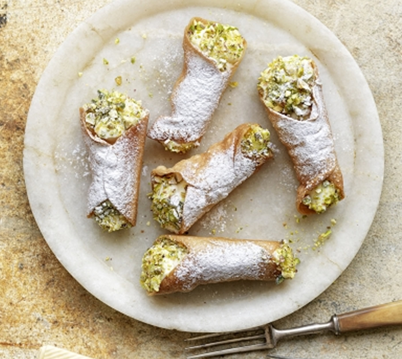 Riempire i cannoli con la ricotta al pistacchio e rifinire le due estremità con la farina di pistacchi, completare con una spolverizzata di zucchero a velo.